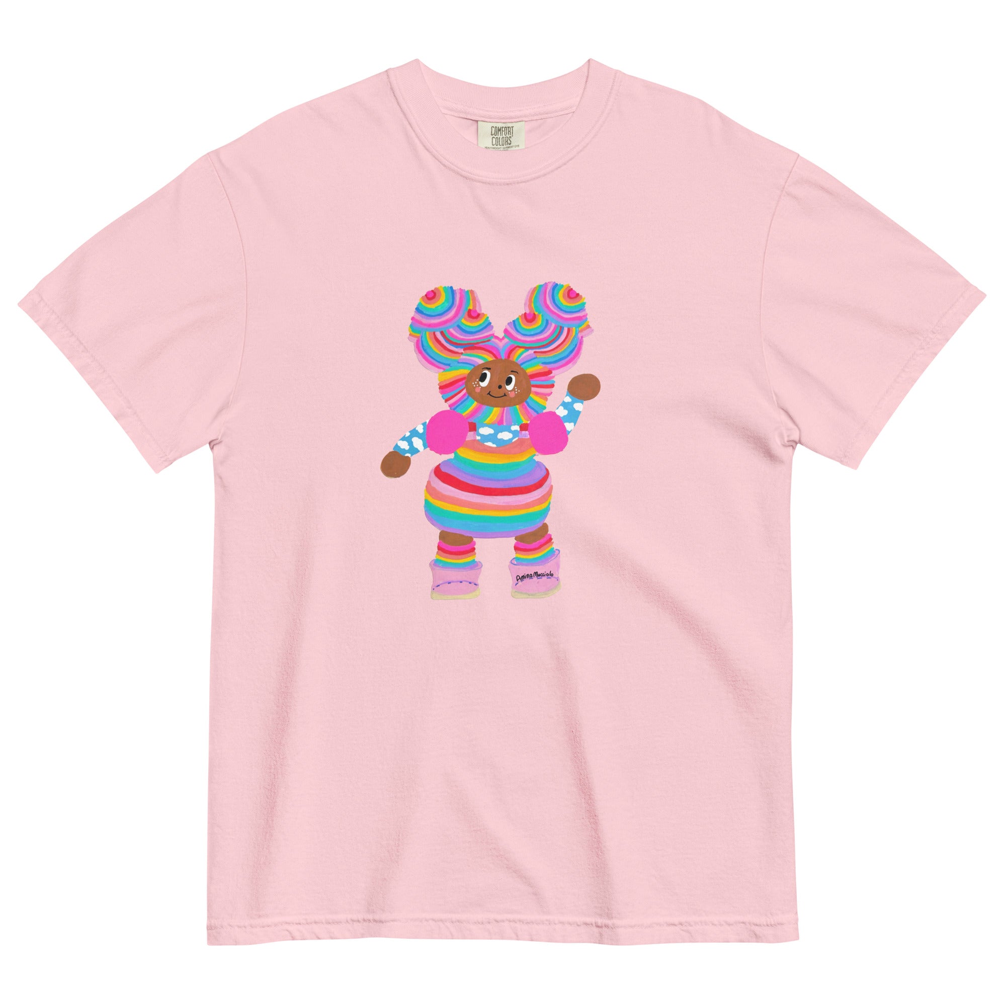 This t-shirt design is based on an original mixed media artwork (acrylic paint, Posca markers, and digital collage) by Amina Mucciolo. T-shirt color: Blossom