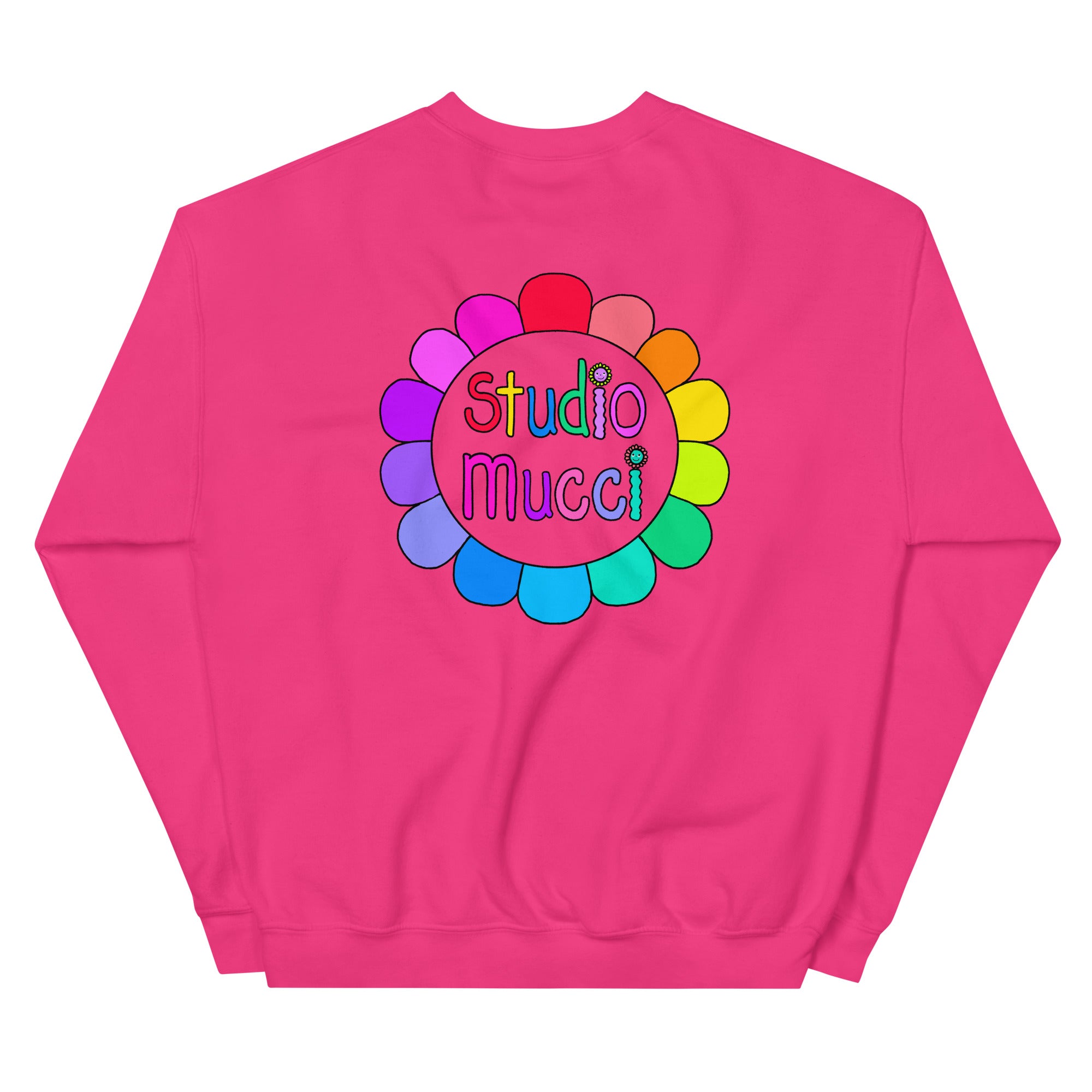 Sweatshirt design is based on an original mixed media artwork (acrylic paint, Posca markers, and digital collage) by Amina Mucciolo