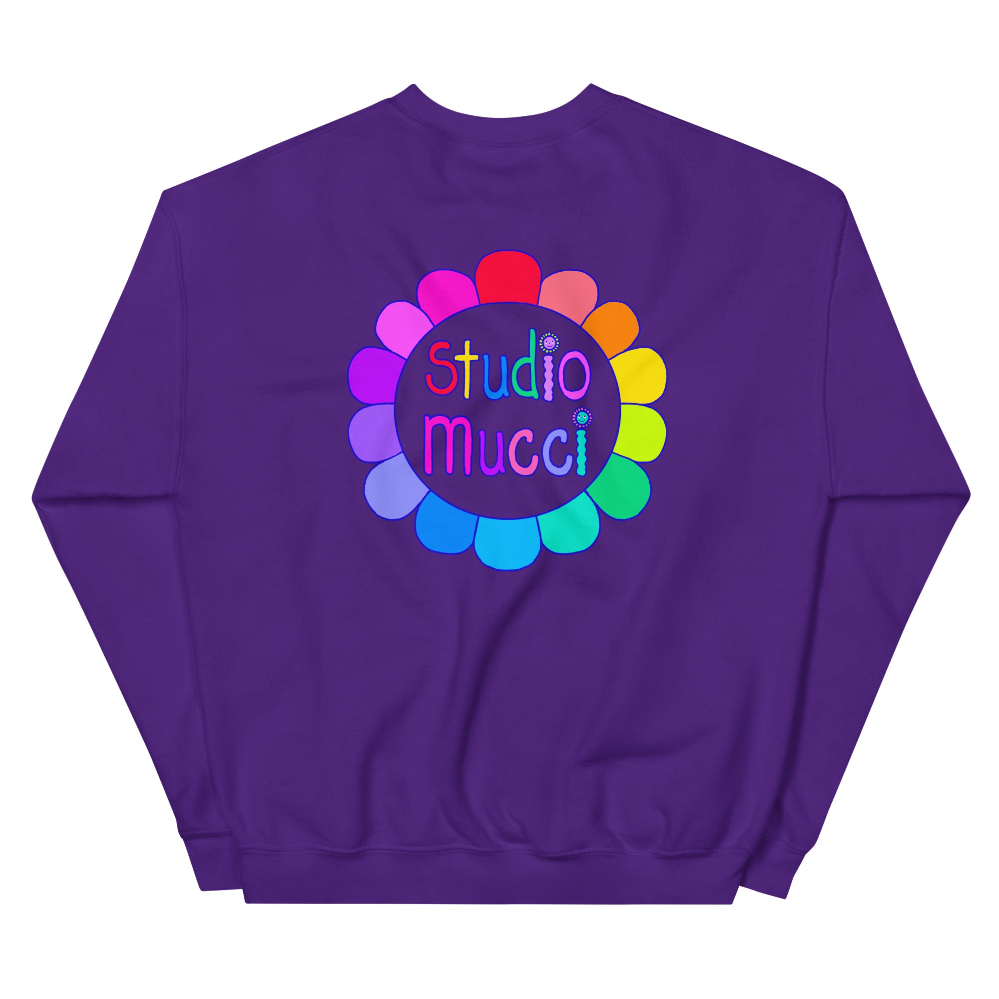 Sweatshirt design is based on an original mixed media artwork (acrylic paint, Posca markers, and digital collage) by Amina Mucciolo